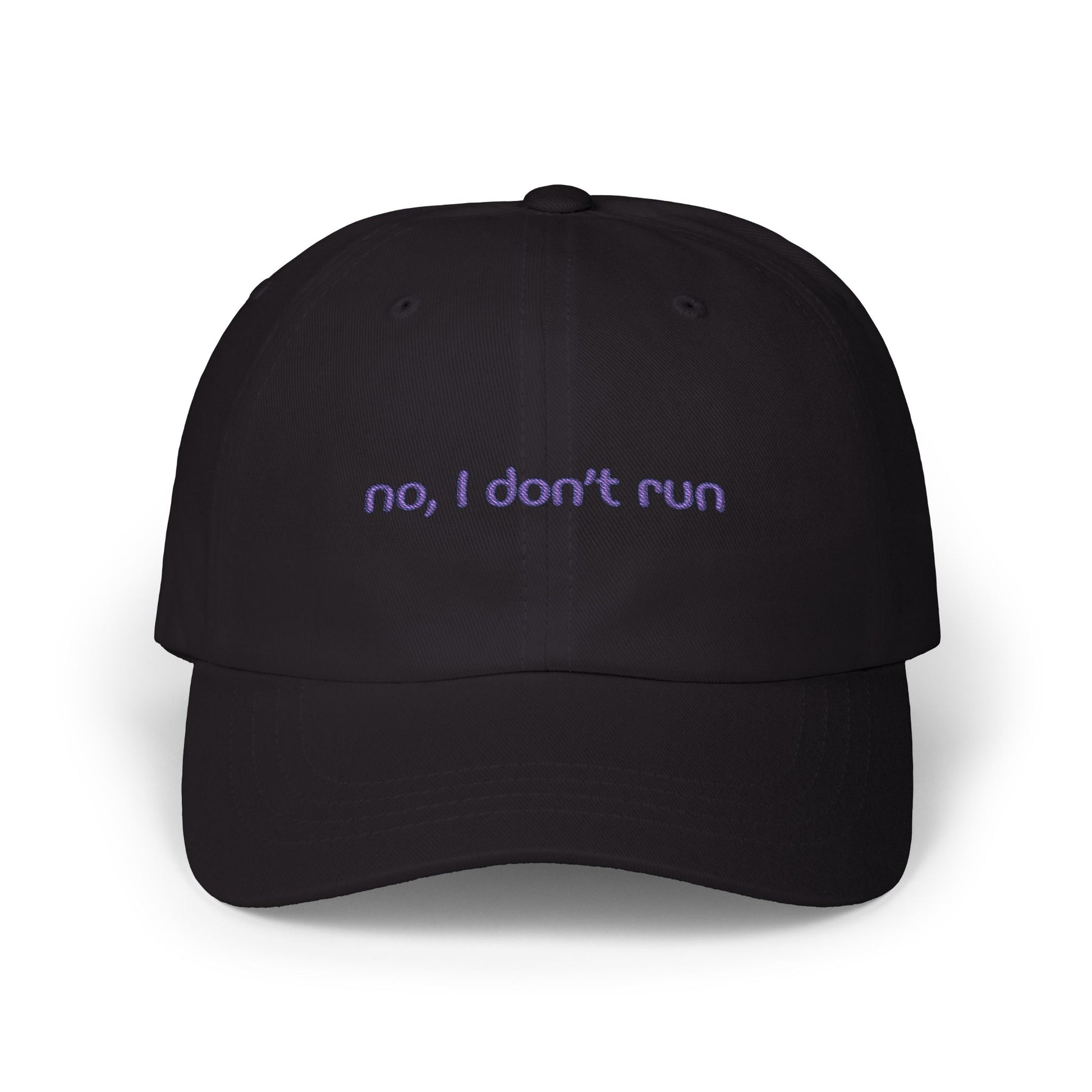 Lightweight, lived-in, and quietly funny — this cap settles into your routine the moment you put it on. Embroidered with a soft, hand-lettered line that reads “no, I don’t run,” it’s the kind of hat that gets a knowing smile from neighbors on morning walks and a laugh at backyard barbecues. The low-profile, unstructured crown and precurved Permacurv® visor give it a relaxed silhouette that pairs easily with a hoodie, denim jacket, or an everyday tee. The antique-brass adjustable strap tucks neatly into a hideaway loop so the back stays clean and streamlined. Made from breathable cotton (with a camo option in a polyester blend), it’s built for daily wear — light, simple, and a little bit sassy.